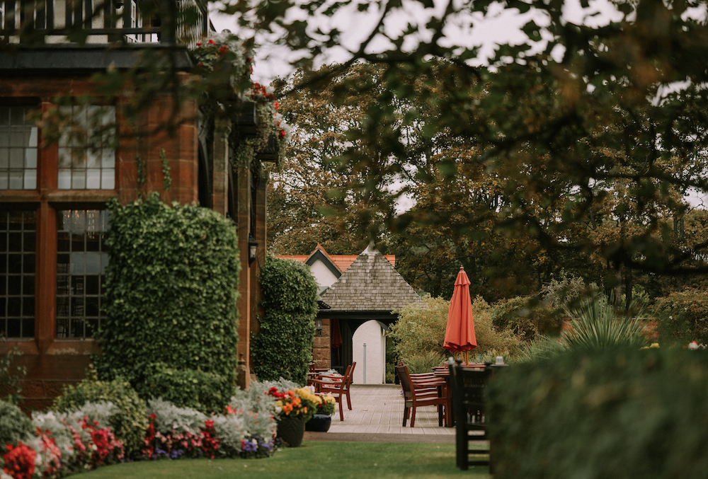 The gardens – Step outside and you’re met with manicured borders, climbing greenery and secluded pathways—perfect for a first look or a quiet moment together after the ceremony. In spring and summer the foliage frames the couple; in autumn and winter the architecture and evergreens keep the frames timeless.
