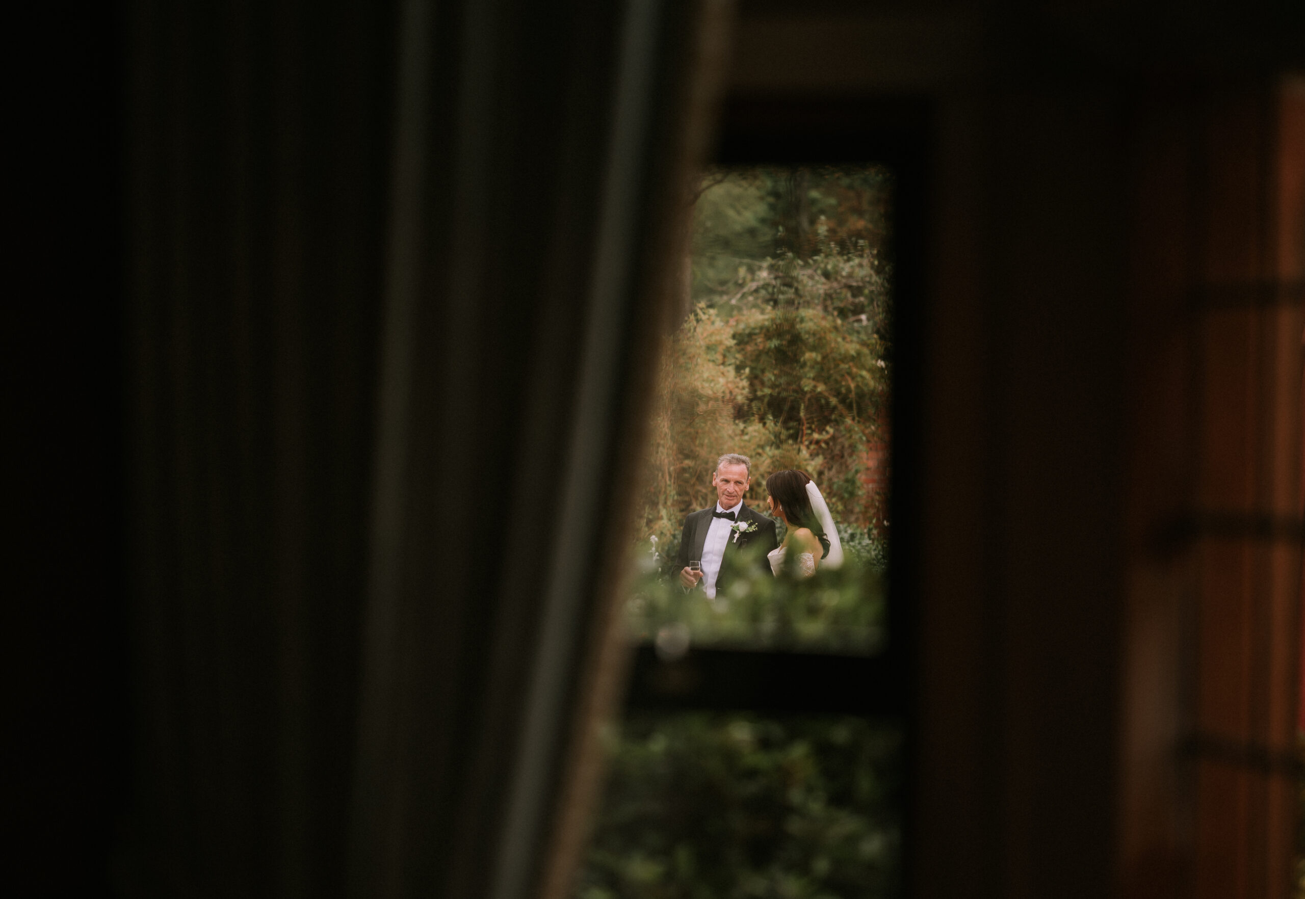 Creative perspective – one favourite frame peers through drapes and a window, revealing the the bride and a guest sharing a quiet word in the garden. It’s romantic, cinematic and distinctly Piersland—private moments set against heritage and greenery.
