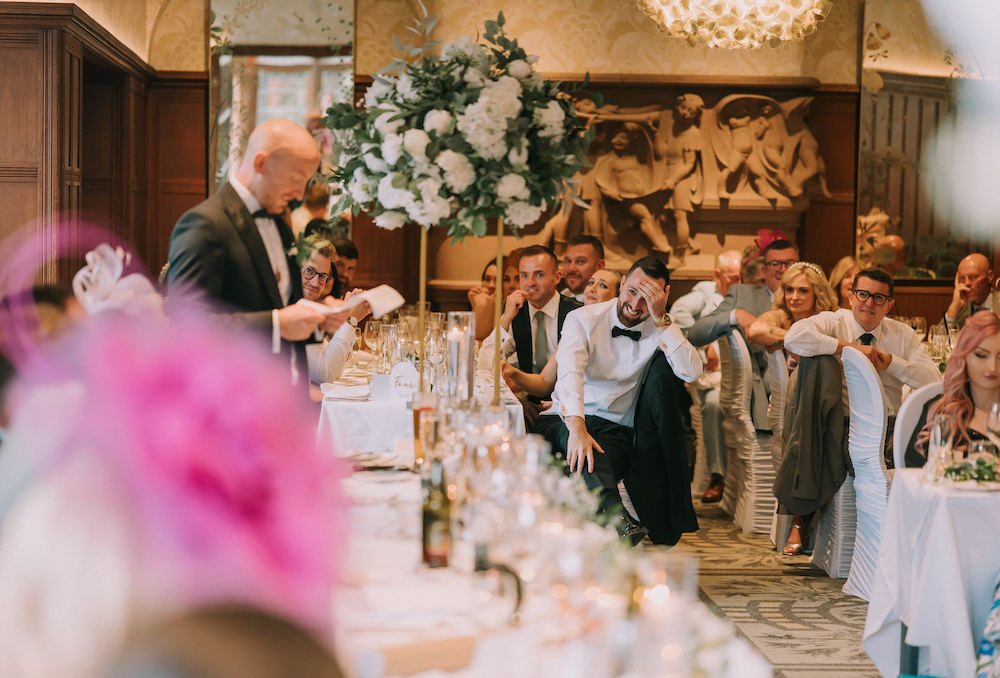 Honest, joyful moments – during the signing of the register, Cara gets close enough to catch a shared smile and the delicate lace of a sleeve, yet wide enough to place the couple within Piersland’s characterful spaces. Later, during speeches, she holds focus on reactions: laughter travelling down a long, flower-dressed top table, glassware catching the light—exactly the images that couples revisit for years because they feel like the day.